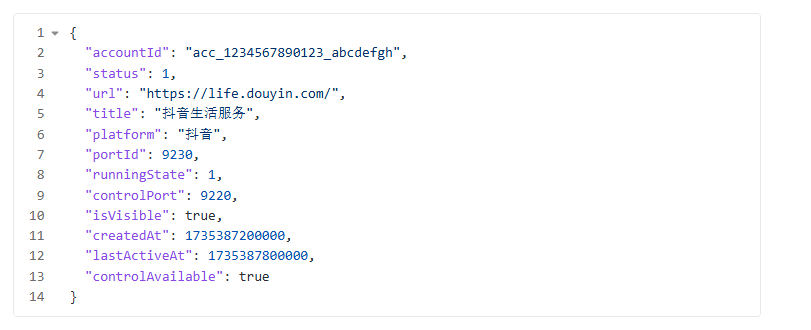 accountId: 账号唯一标识status: 浏览器状态(1正常/0暂停/-1停止)url: 当前页面URLtitle: 当前页面标题platform: 平台类型(抖音/小红书/拼多多等)portId: 端口标识符runningState: 运行状态(1正常/0暂停/-1停止)controlPort: CDP控制端口(固定9220)isVisible: 是否当前可见controlAvailable: 是否可控制