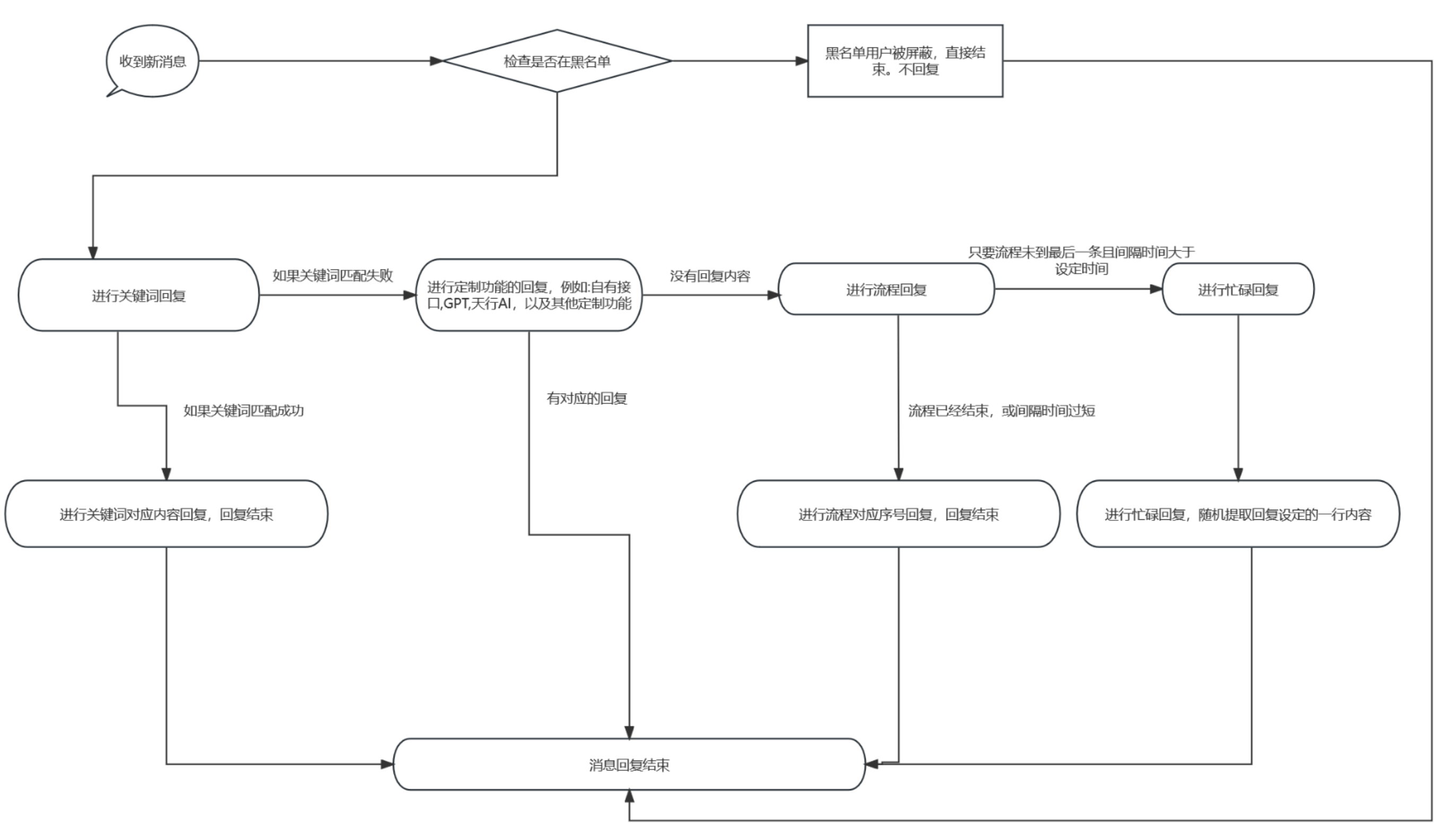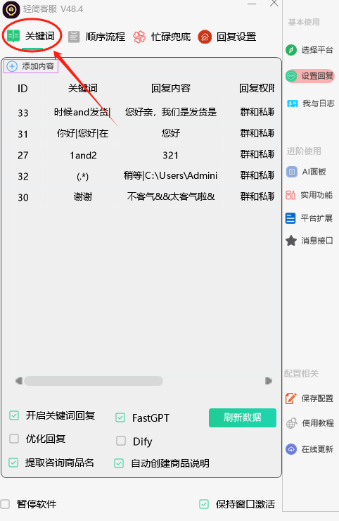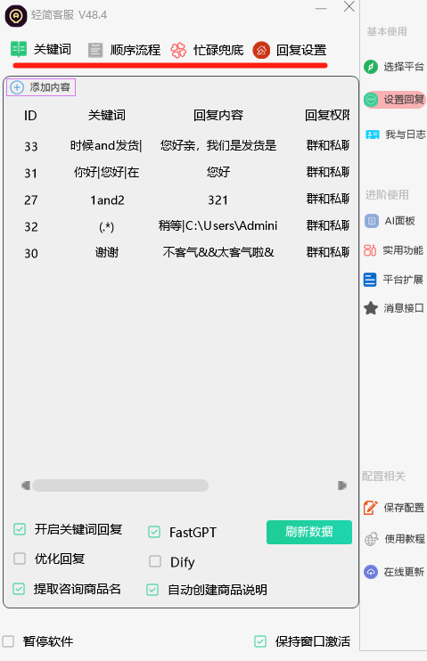 关键词回复=>流程回复=>忙碌回复(注意:若是关键词已经触发,则不会向后处理。)