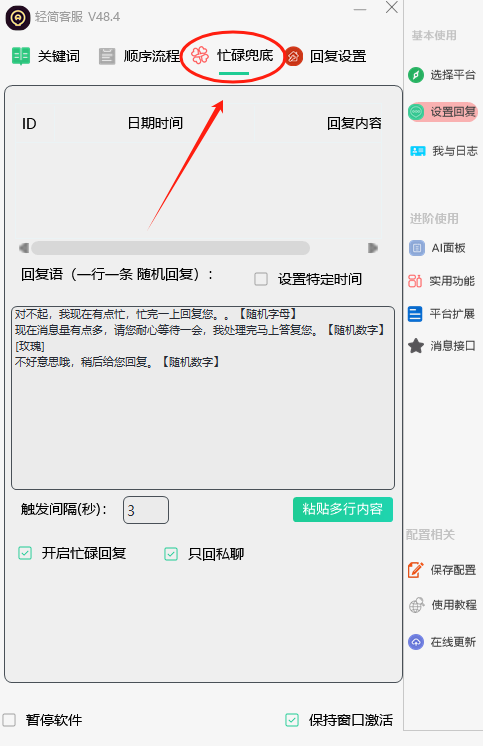快捷回复功能。这是一个手动发送的功能,并非自动回复,需要手动鼠标,双击对应列内容,即可快速发送对应设置的内容。